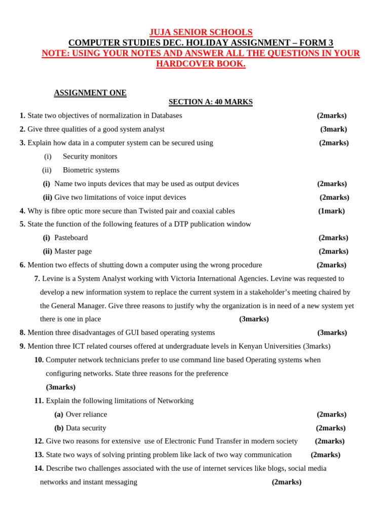 COMPUTER STUDIES DEC. HOLIDAY ASSIGNMENT – FORM 3