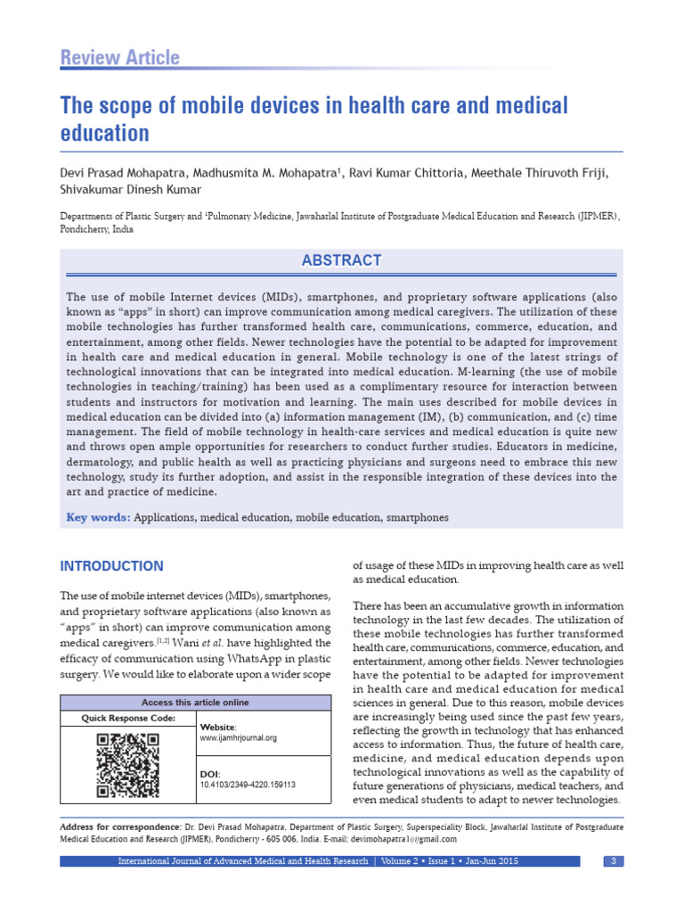 Mohapatra, et al.: Mobile devices in health care and medical education