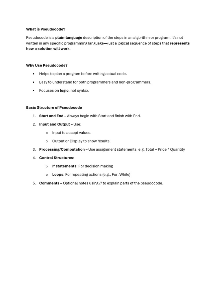 5. Comments – Optional notes using // to explain parts of the pseudocode.