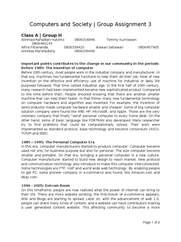Important points contributes to the change in our community in the periods Before 1985: The invention of computer Before 20th century, most people work in the industial company and manufacturer. In that era, machines has fundamental functions to help them do their job. Most of new invention on the effective and efficiency use of machine for industrial or daily life purposes followed. That time callled industrial age. In the first half of 20th century, many research had been implemented became new sophisticated product (compared to the time before that). People shocked knowing that there are another smaller machine that can help them faster. In that thime, many new fundamental technology on computer hardware and algorithm was invented. For example, the invention of semiconductor made computer hardware smaller and cheaper. Some of big computer solution company were found like IMB, HP, Microsoft, and Apple. Those are the very visionary company that finally "send" personal computer to every home desk. On the other hand, some of basic language like FORTRAN also developed. Many researcher try to find problems that could be computationally solved. Their work were implemented as standard protocol, base technology and became consorsium (ASCII, TCP/IP and IEEE). 1985 1995: The Personal Computer Era In this era, computer manufacturers started to produce computer. Computer became used not only for business purpose but also for personal. The size computer become smaller and portable. On that era, bringing a personal computer is a new culture. Computer manufacturer started to build new design to reach market. New protocol and communication technology also introduce to make this computer interconnected. Some technologies are FTP, VoIP and world wide web technology. By enabling people to get PC, some pioneer company in e-commerce also found, like Amazon.com and ebay.com. 1996 - 2005: Dotcom Boom On this timeframe, people are now realized what the power of internet can bring to their life. There are more website existing, the first-mover of e-commerce appears, Wiki and Blogs are starting to spread. Later on, with the advancement of web 2.0, people can share many kinds of content, and a website can have contributors making a user generated content website. This affecting community to become a more