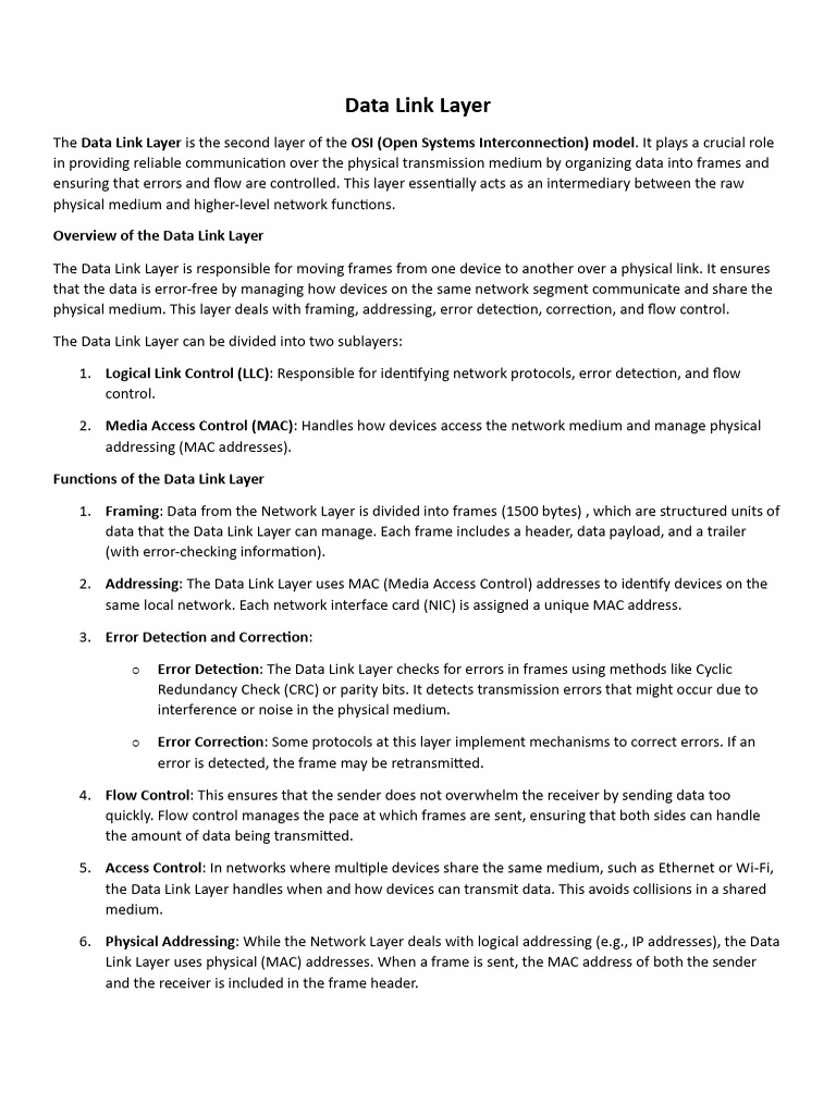 o Error Detection: The Data Link Layer checks for errors in frames using methods like Cyclic