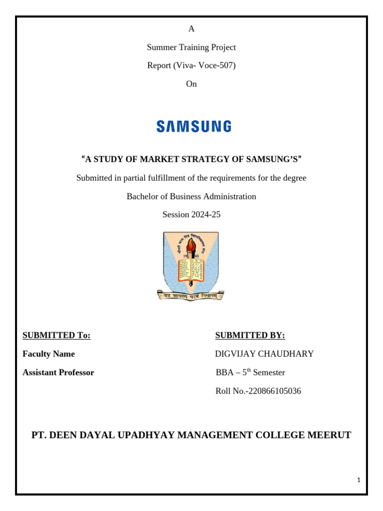 A Summer Training Project Report (Viva-Voce-507) On: A Study of Market Strategy of Samsung'S