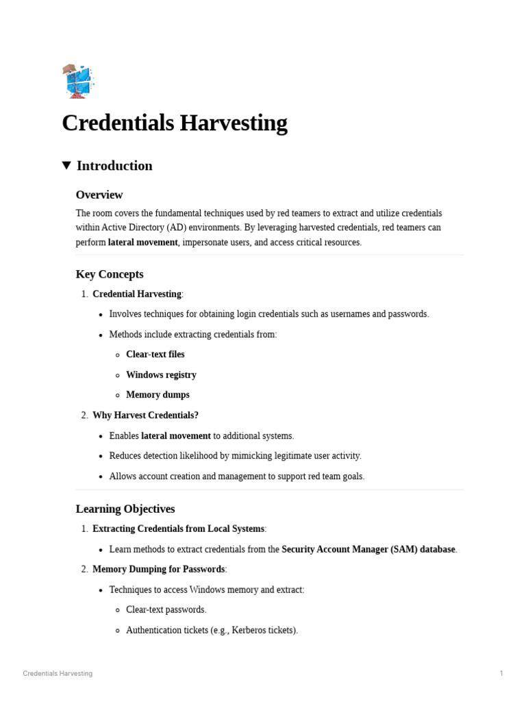 The room covers the fundamental techniques used by red teamers to extract and utilize credentials