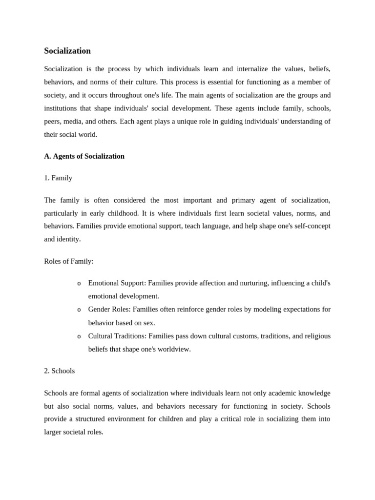 society, and it occurs throughout one's life. The main agents of socialization are the groups and