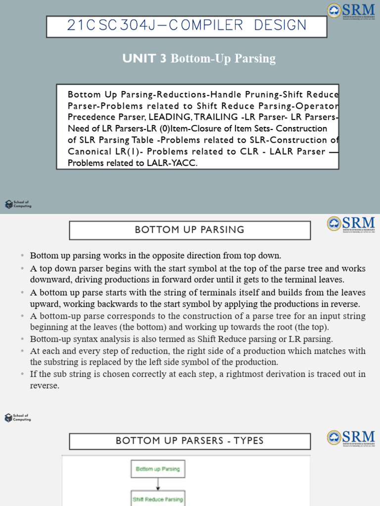 • LR parsing is divided into four parts: LR (0) parsing, SLR parsing, CLR parsing and LALR parsing.