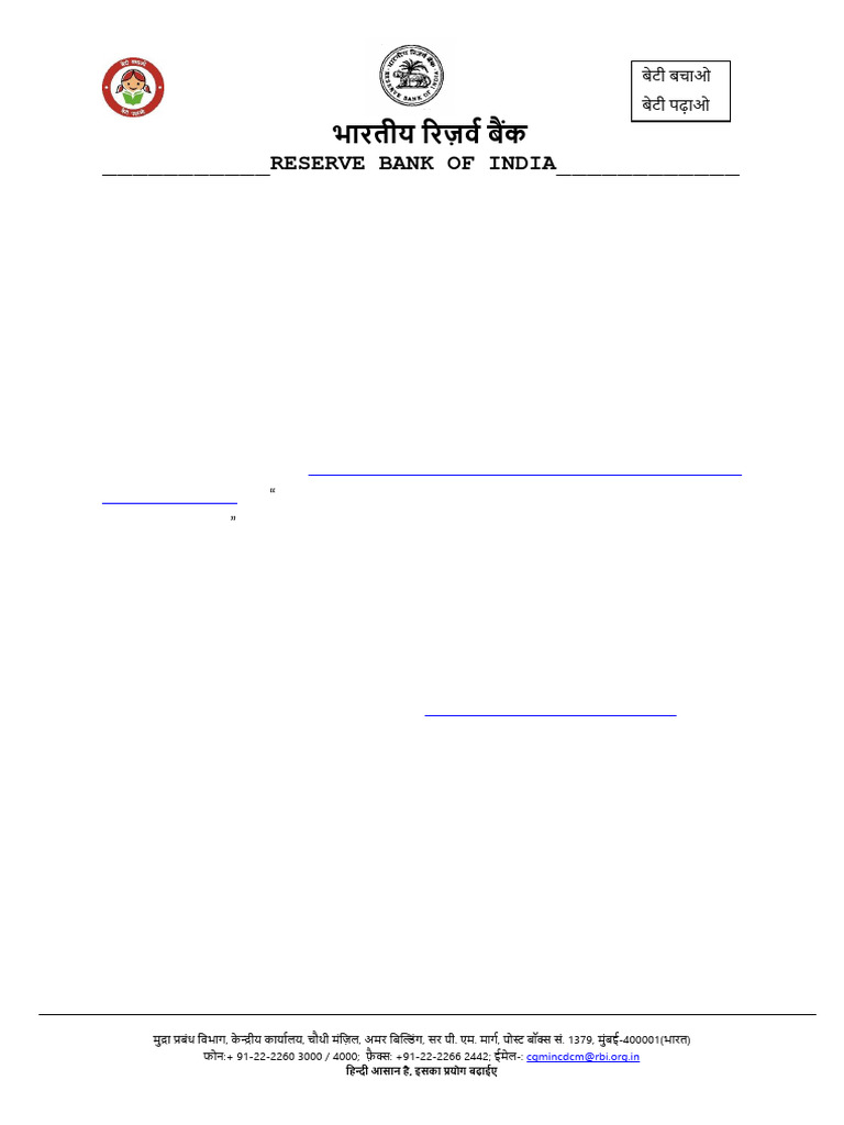 फोन:+ 91-22-2260 3000 / 4000; फ़ैक्स: +91-22-2266 2442; ईमेल-: cgmincdcm@rbi.org.in