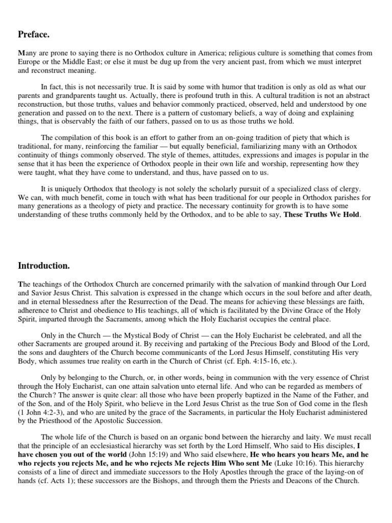 Many are prone to saying there is no Orthodox culture in America; religious culture is something that comes from Europe or the Middle East; or else it must be dug up from the very ancient past, from which we must interpret and reconstruct meaning. In fact, this is not necessarily true. It is said by some with humor that tradition is only as old as what our parents and grandparents taught us. Actually, there is profound truth in this. A cultural tradition is not an abstract reconstruction, but those truths, values and behavior commonly practiced, observed, held and understood by one generation and passed on to the next. There is a pattern of customary beliefs, a way of doing and explaining things, that is observably the faith of our fathers, passed on to us as those truths we hold. The compilation of this book is an effort to gather from an on-going tradition of piety that which is traditional, for many, reinforcing the familiar but equally beneficial, familiarizing many with an Orthodox continuity of things commonly observed. The style of themes, attitudes, expressions and images is popular in the sense that it has been the experience of Orthodox people in their own life and worship, representing how they were taught, what they have come to understand, and thus, have passed on to us. It is uniquely Orthodox that theology is not solely the scholarly pursuit of a specialized class of clergy. We can, with much benefit, come in touch with what has been traditional for our people in Orthodox parishes for many generations as a theology of piety and practice. The necessary continuity for growth is to have some understanding of these truths commonly held by the Orthodox, and to be able to say, These Truths We Hold.