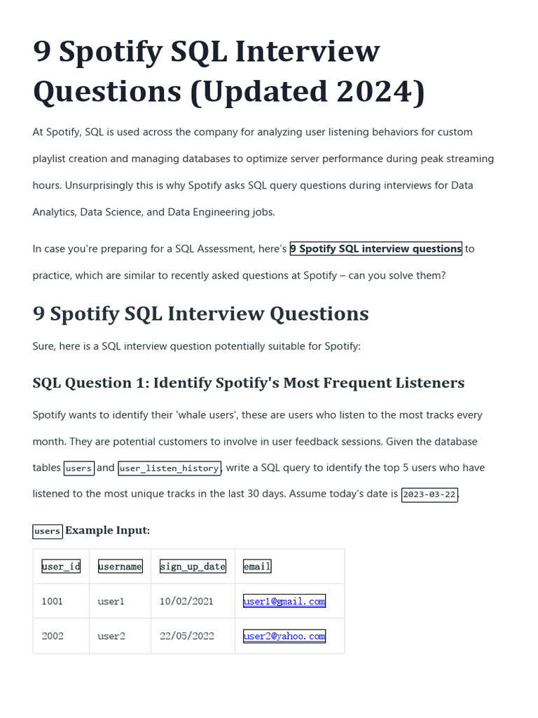 In case you're preparing for a SQL Assessment, here’s 9 Spotify SQL interview questions to