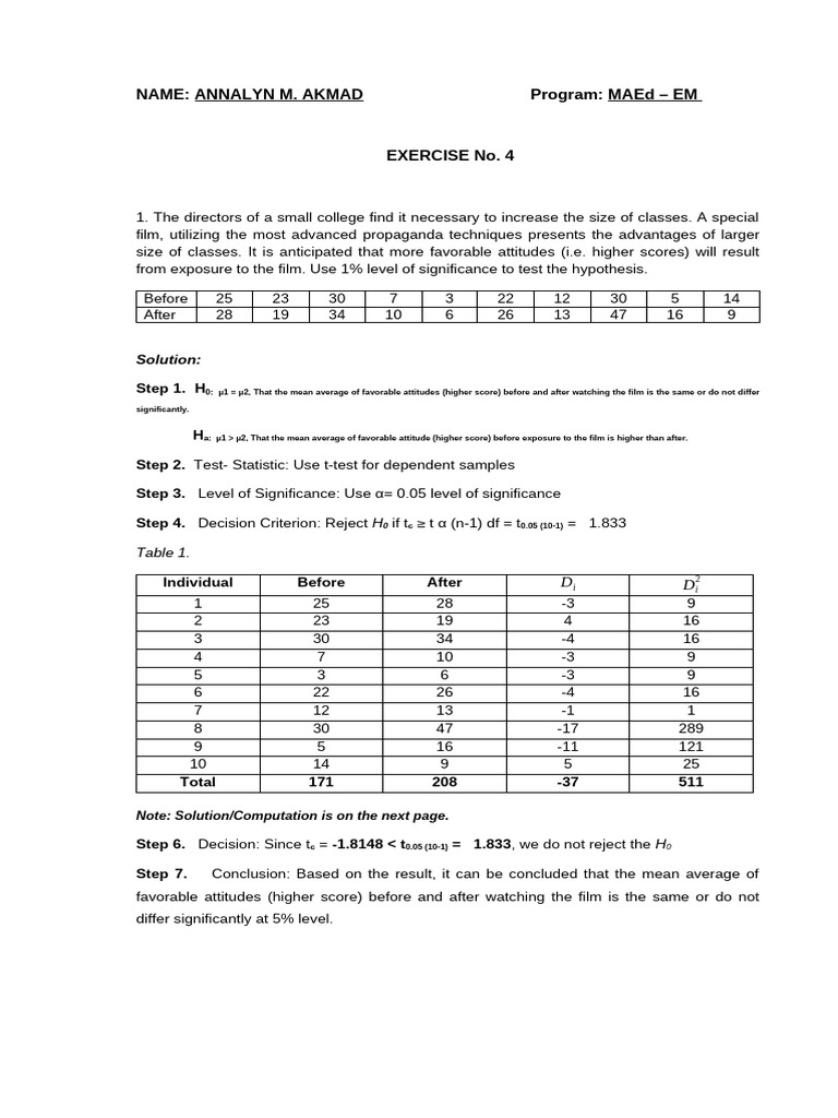 Step 1. H0: µ1 = µ2, That the mean average of favorable attitudes (higher score) before and after watching the film is the same or do not differ