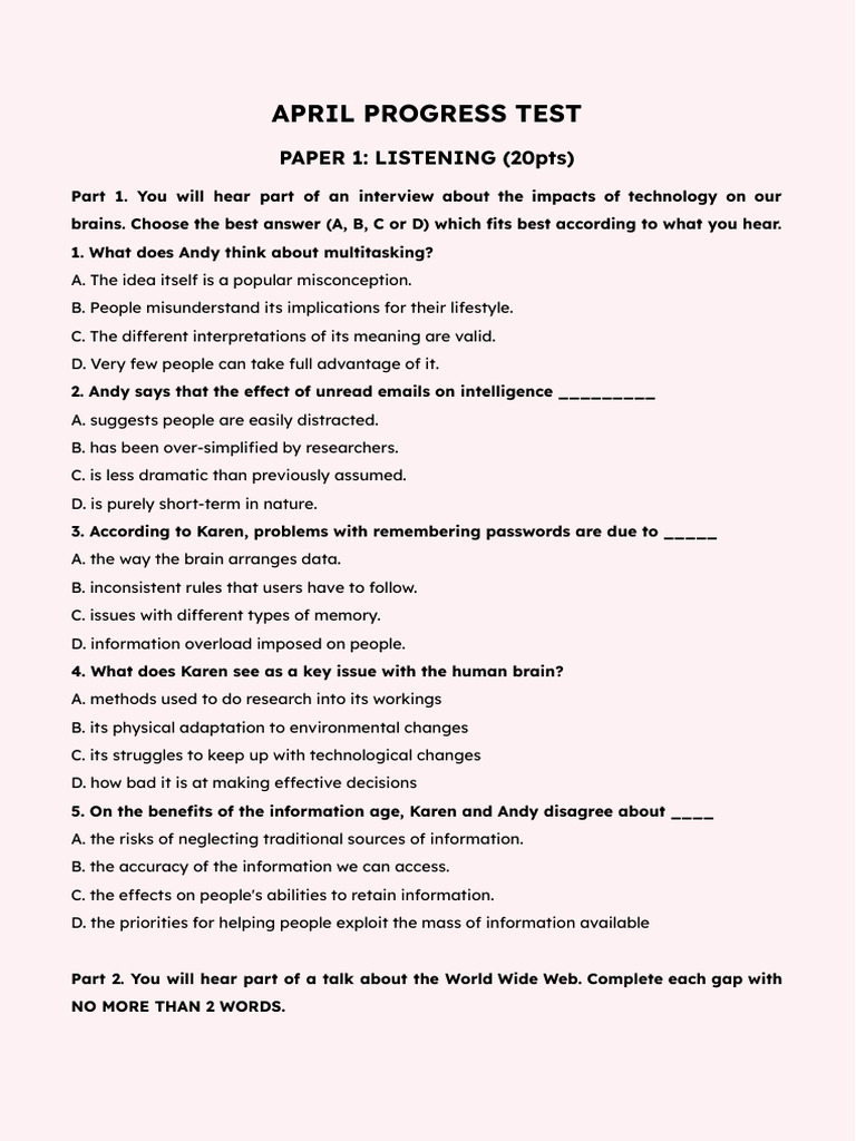Part 2. Read the following passage and decide which answer (A, B, C or D) best fits each