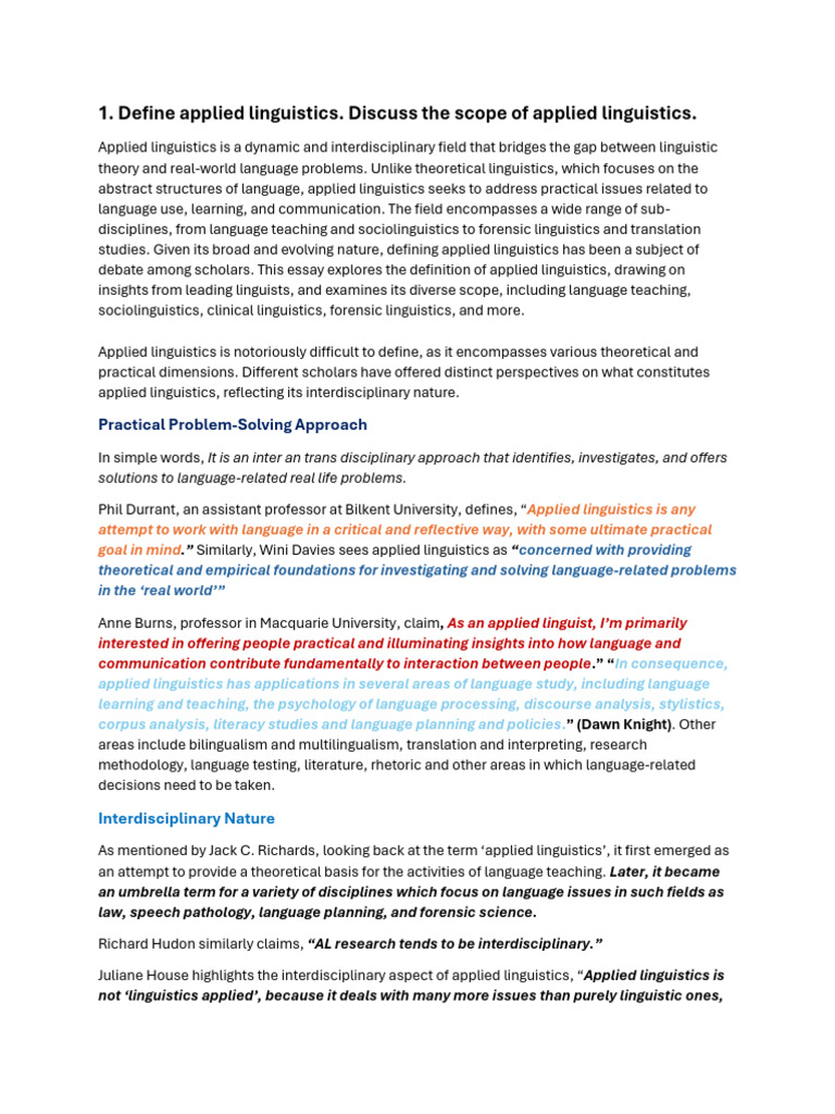 1. Define applied linguistics. Discuss the scope of applied linguistics.