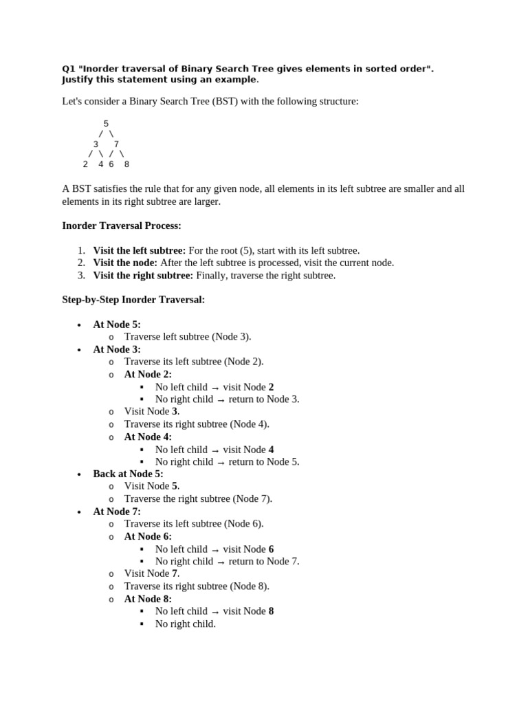 Q1 "Inorder traversal of Binary Search Tree gives elements in sorted order".