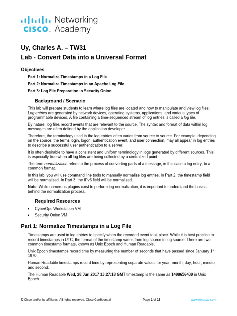 In this lab, you will use command line tools to manually normalize log entries. In Part 2, the timestamp field
