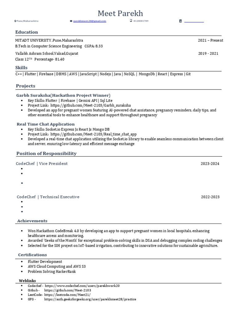 Pune,Maharashtra parekhmeet.28@gmail.com 8128081789 LinkedinProfile