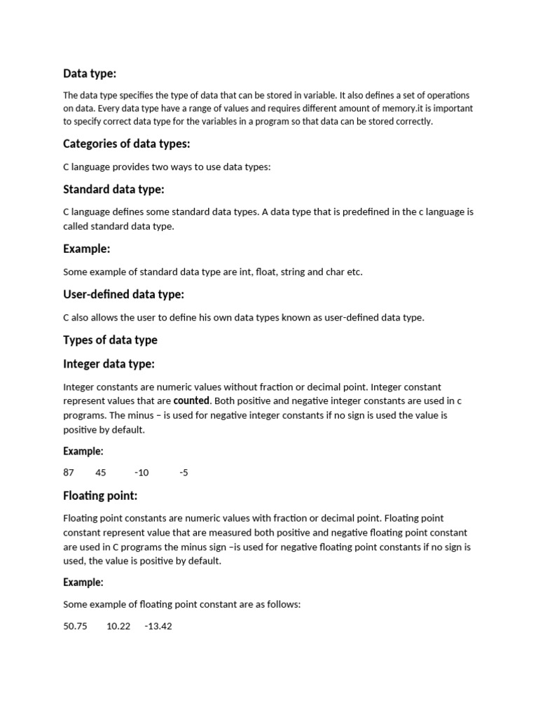 The data type specifies the type of data that can be stored in variable. It also defines a set of operations
