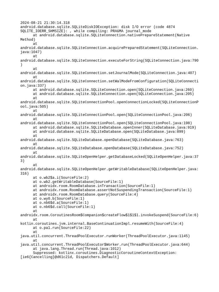 android.database.sqlite.SQLiteDiskIOException: disk I/O error (code 4874