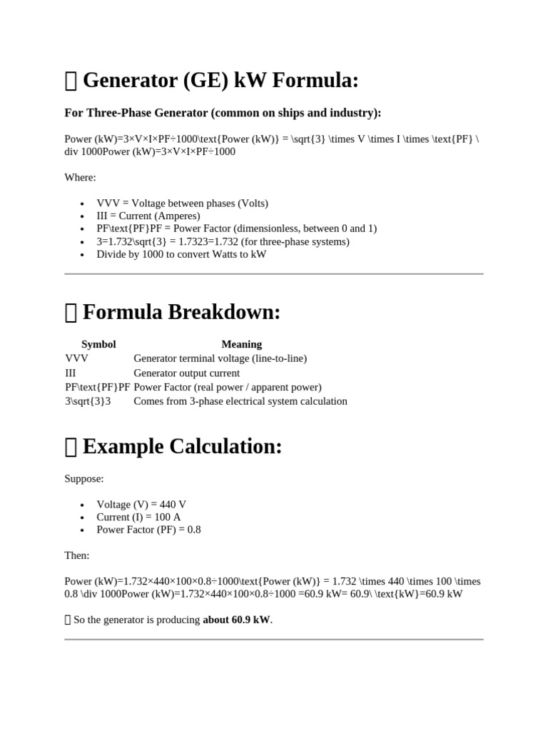 🔹 Generator (GE) kW Formula: