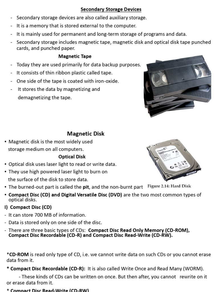 - Secondary storage includes magnetic tape, magnetic disk and optical disk tape punched
