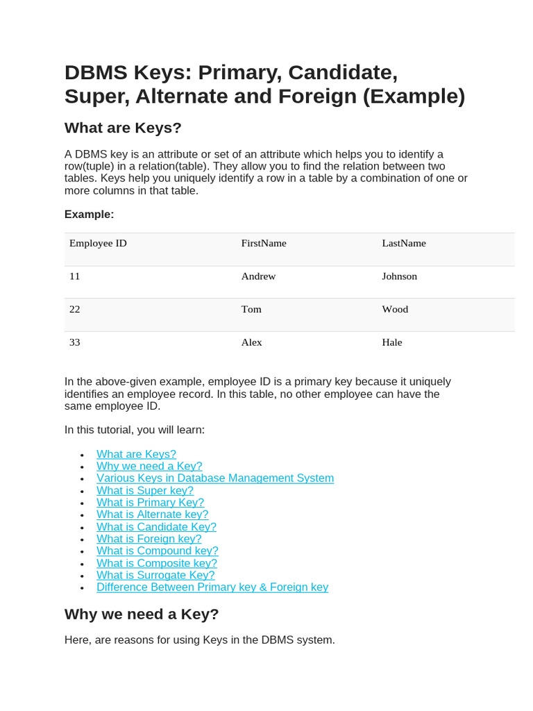 A DBMS key is an attribute or set of an attribute which helps you to identify