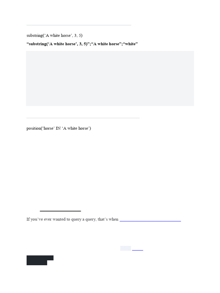 select 'position(''horse'' IN ''A white horse'')' as function_call,