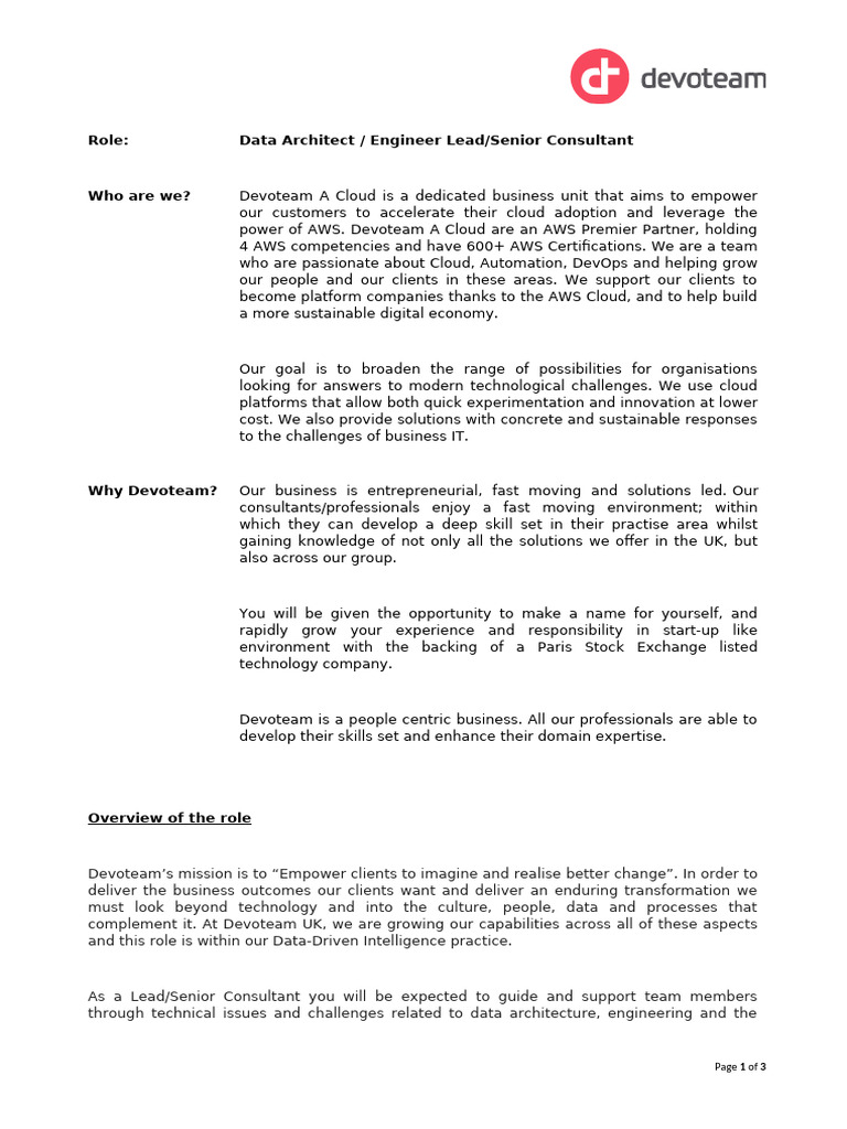 Role: Data Architect / Engineer Lead/Senior Consultant