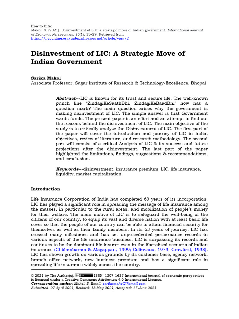 Makol, S. (2021). Disinvestment of LIC: a strategic move of Indian government. International Journal
