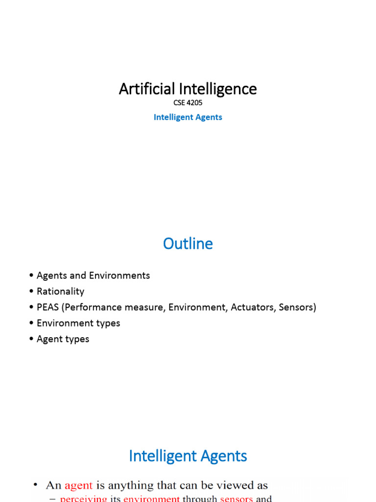 • PEAS (Performance measure, Environment, Actuators, Sensors)
