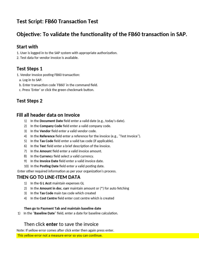 1. The FB60 transaction has been successfully tested for creating and posting a vendor invoice.