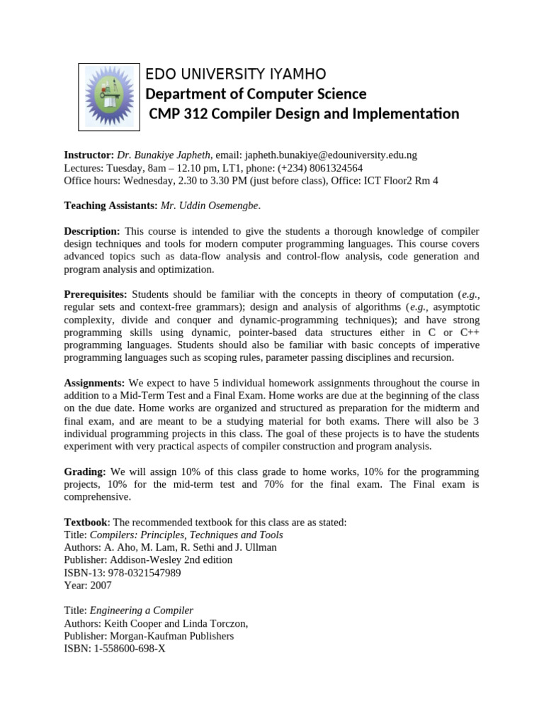 Description: This course is intended to give the students a thorough knowledge of compiler