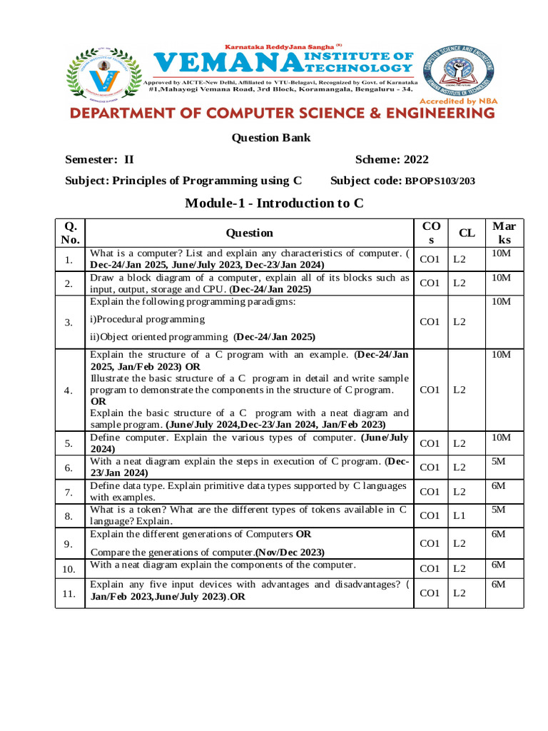 Subject: Principles of Programming using C Subject code: BPOPS103/203