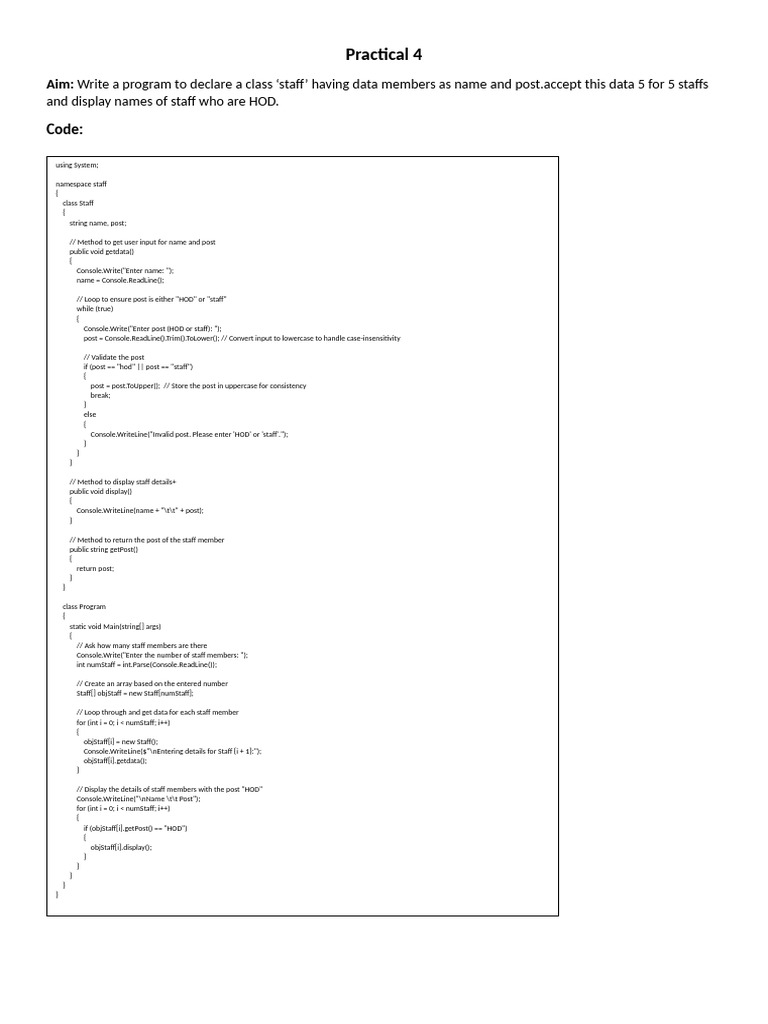 Console.WriteLine("Invalid post. Please enter 'HOD' or 'staff'.");