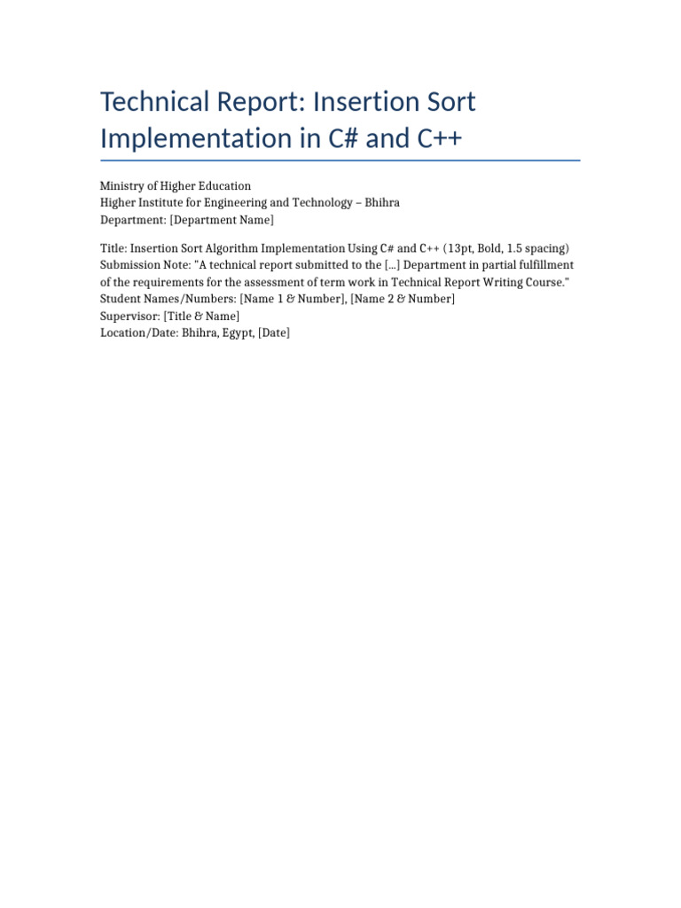 Title: Insertion Sort Algorithm Implementation Using C# and C++ (13pt, Bold, 1.5 spacing)