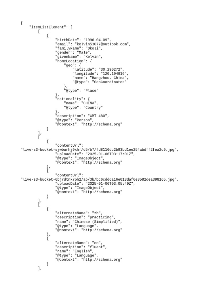 The document contains detailed information about an individual named Kelvin Okoli, including personal details such as birth date, nationality, and language proficiency. It also includes images, comments, answers to questions regarding language practice and preferences for a Tandem buddy, as well as device identifiers and login information. Overall, it serves as a structured profile for Kelvin in the context of language learning and social interaction.