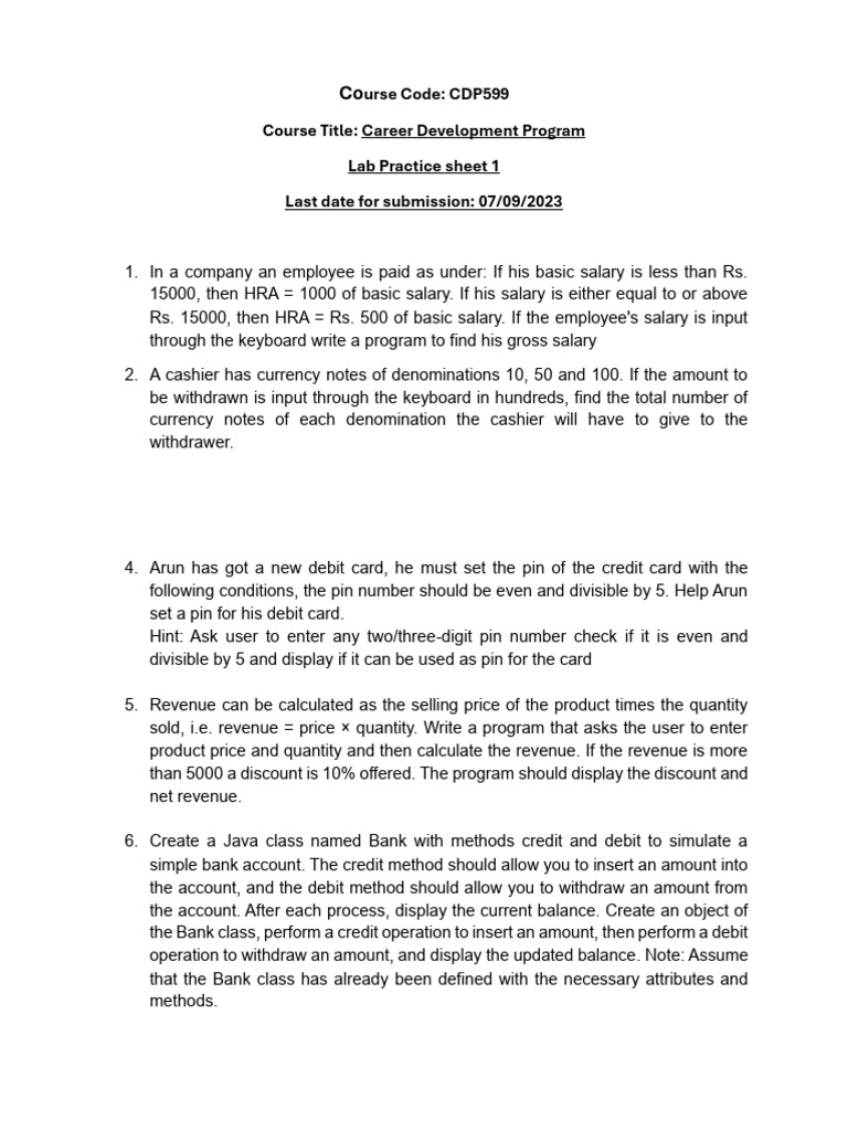 6. Create a Java class named Bank with methods credit and debit to simulate a