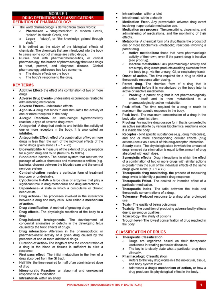 PHARMACOLOGY (TRANSCRIBED BY: TITO V. BAUTISTA JR.) 1