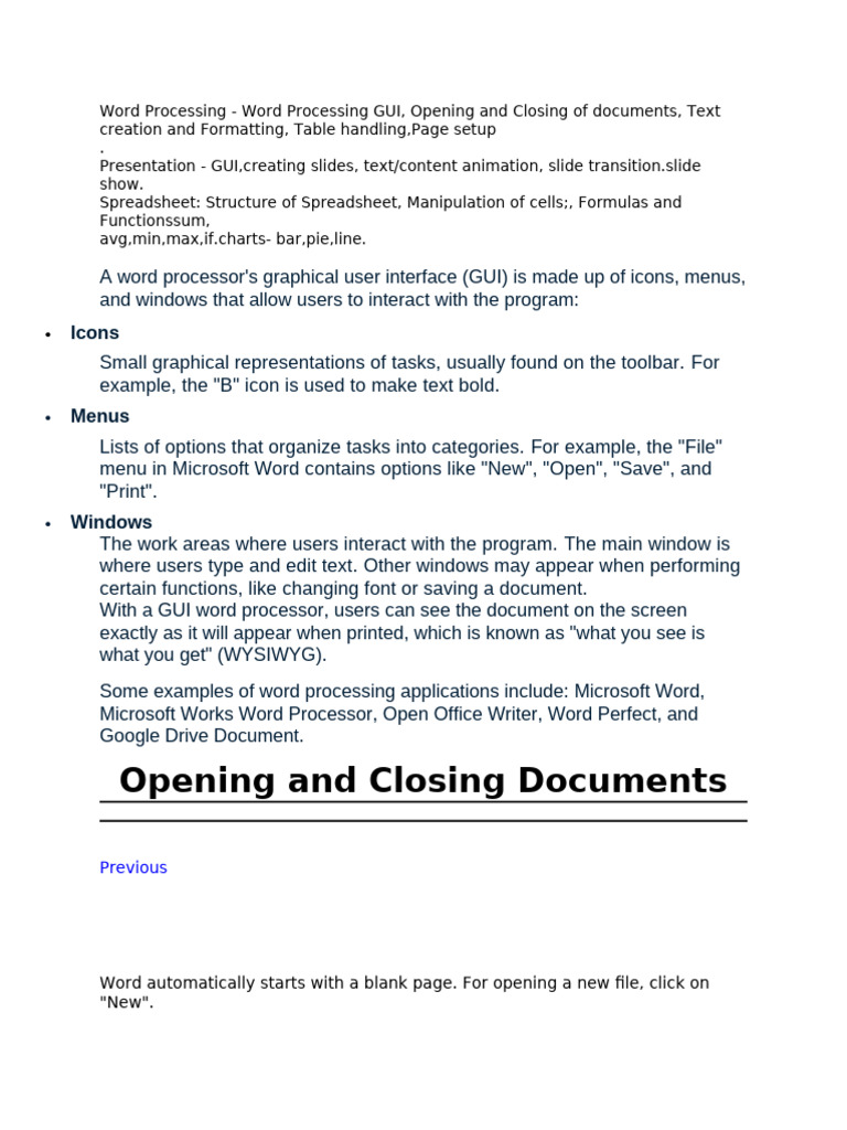 Word Processing - Word Processing GUI, Opening and Closing of documents, Text
