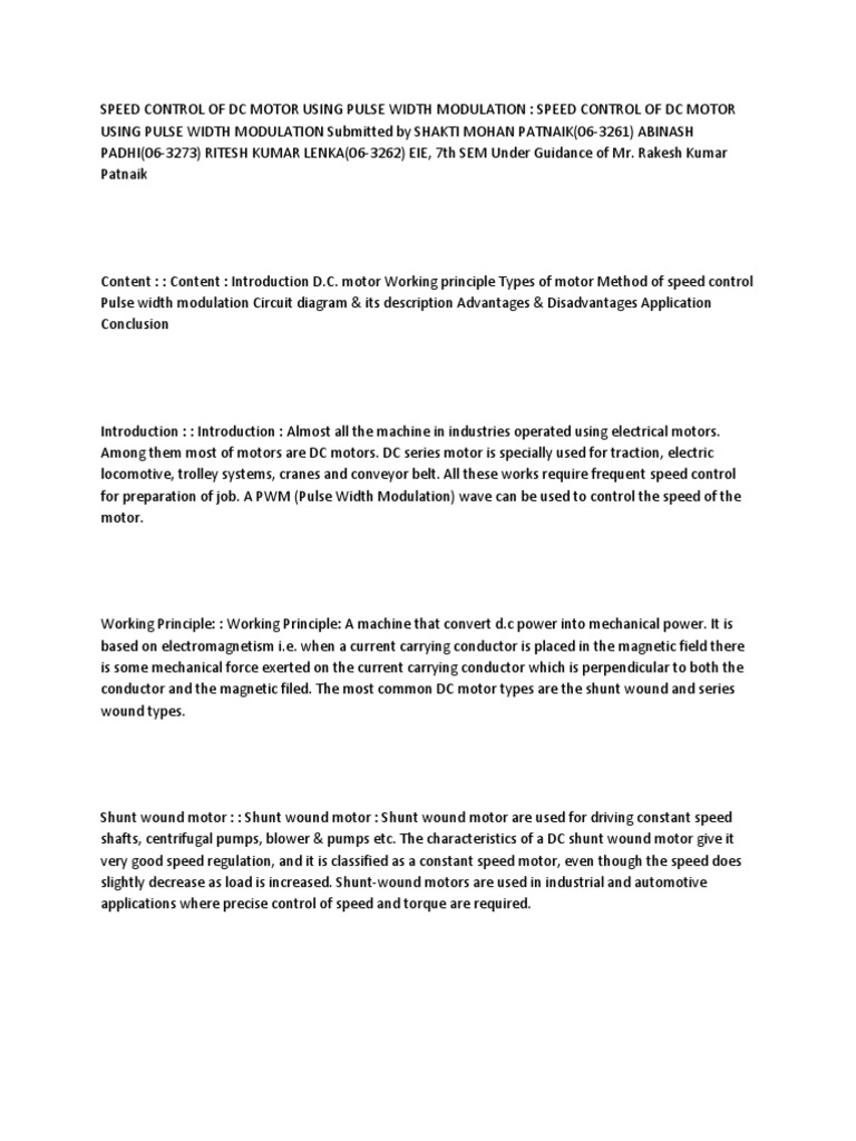 SPEED CONTROL OF DC MOTOR USING PULSE WIDTH MODULATION : SPEED CONTROL OF DC MOTOR USING PULSE WIDTH MODULATION Submitted