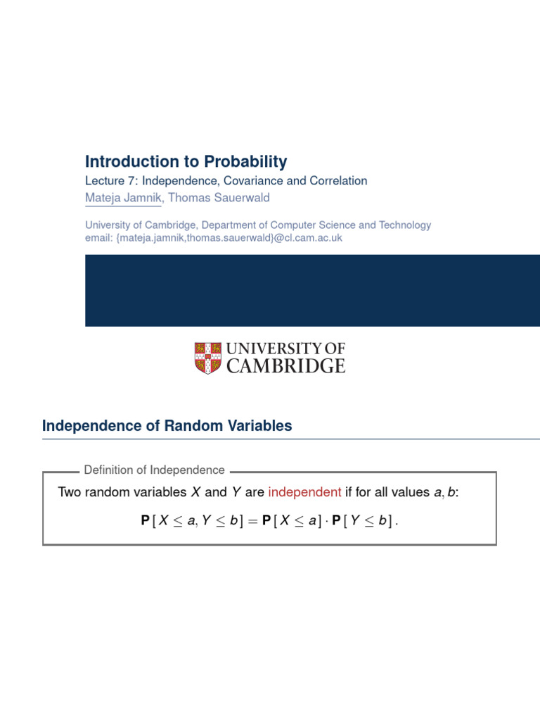 Lecture 7: Independence, Covariance and Correlation