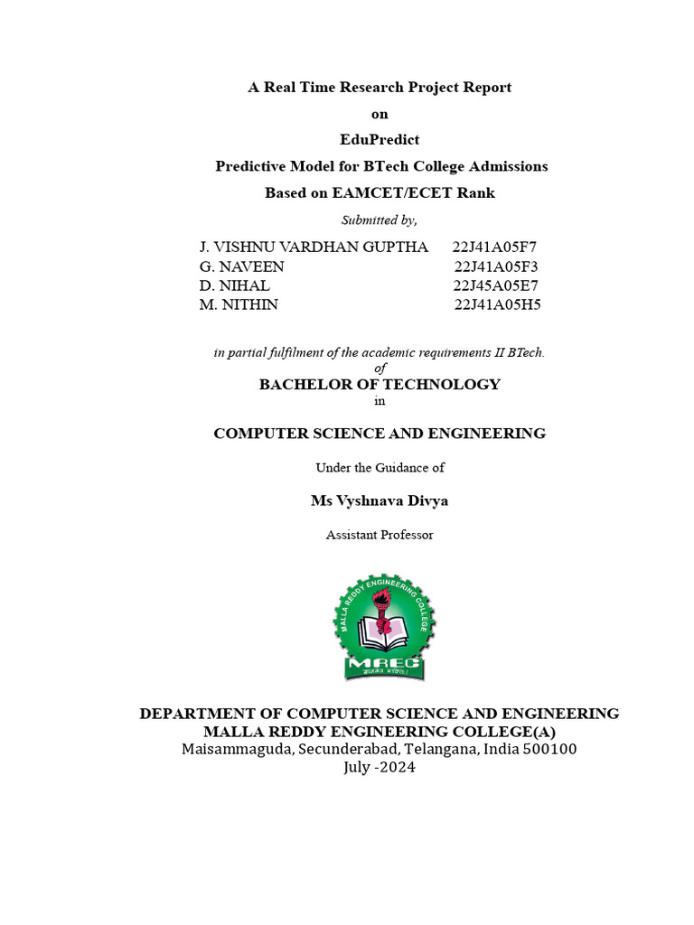 EAMCET/ECET Rank”, submitted by J. VISHNU VARDHAN GUPTHA