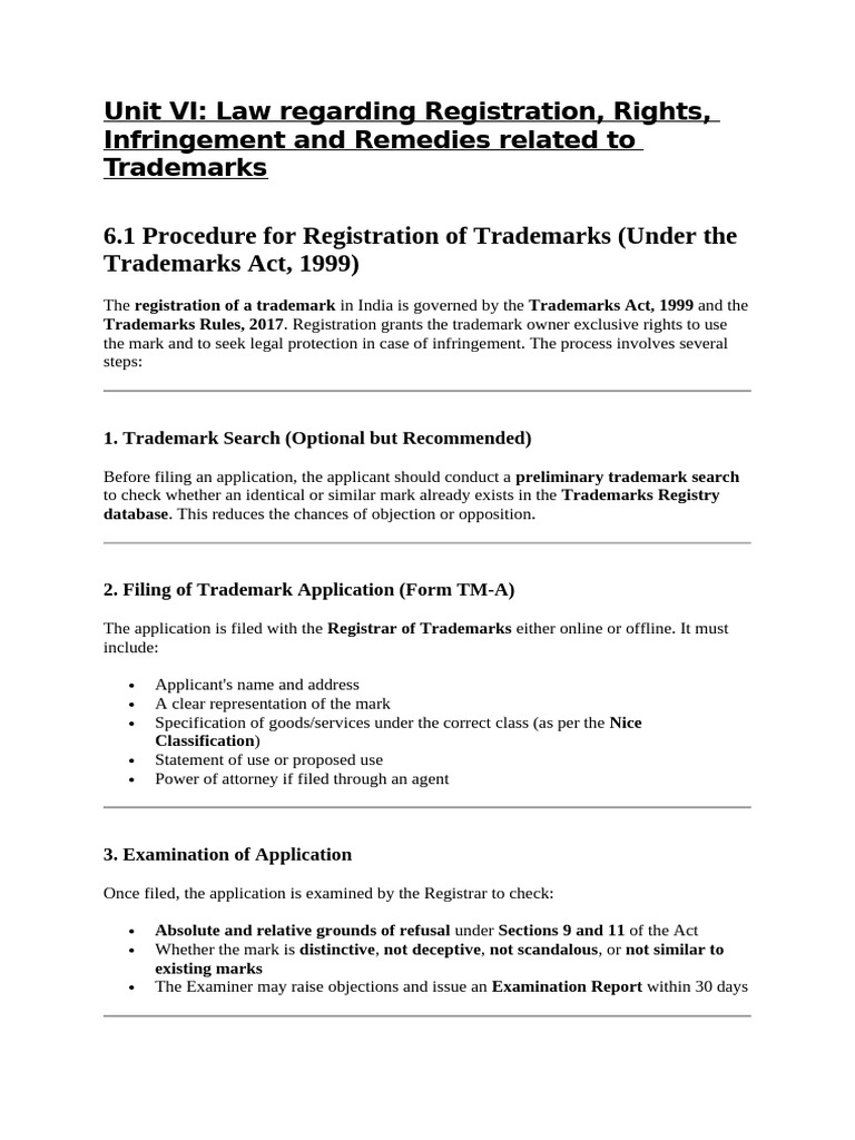 6.1 Procedure for Registration of Trademarks (Under the