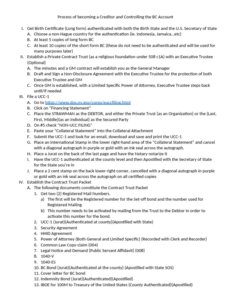 Process of becoming a Creditor and Controlling the BC Account