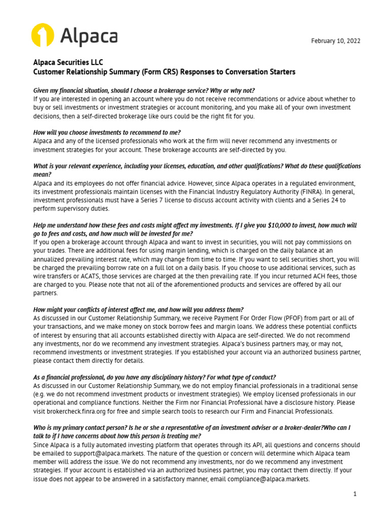 of interest by ensuring that all accounts established directly with Alpaca are self-directed. We do not recommend
