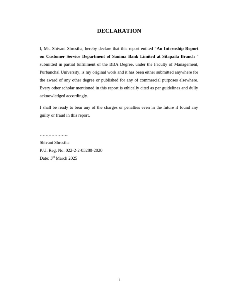 I, Ms. Shivani Shrestha, hereby declare that this report entited "An Internship Report