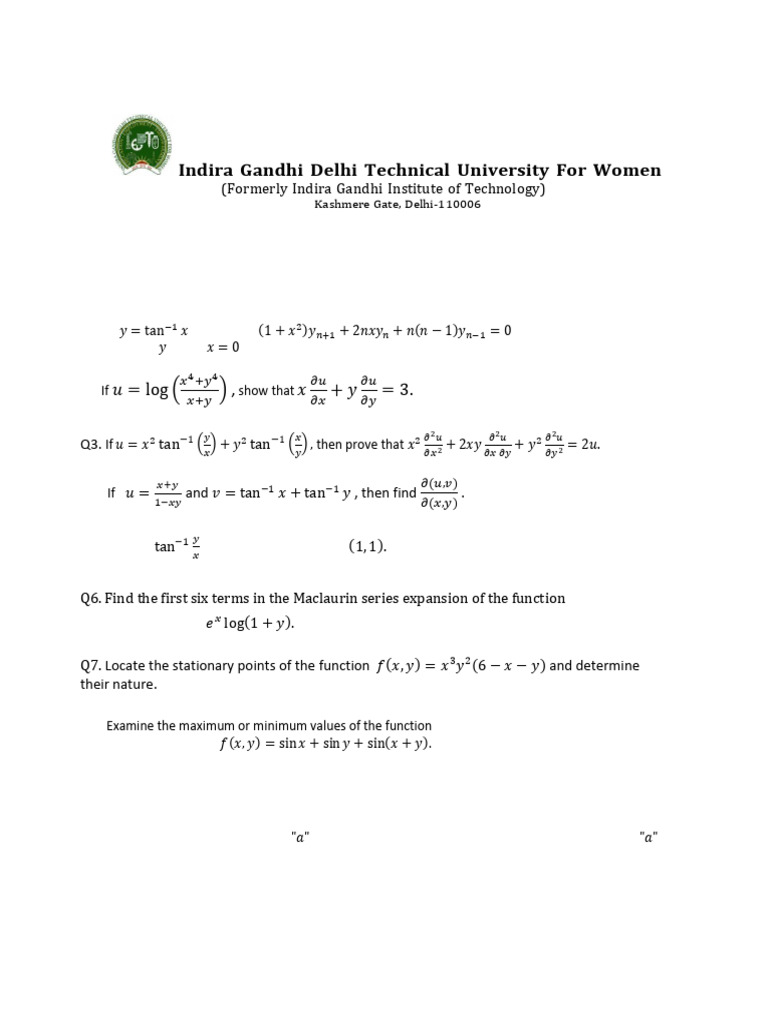 Q3. If 𝑢 = 𝑥 2 tan−1 (𝑥 ) + 𝑦 2 tan−1 (𝑦) , then prove that 𝑥 2 𝜕𝑥 2 + 2𝑥𝑦 𝜕𝑥 𝜕𝑦 + 𝑦 2 𝜕𝑦2 = 2𝑢.