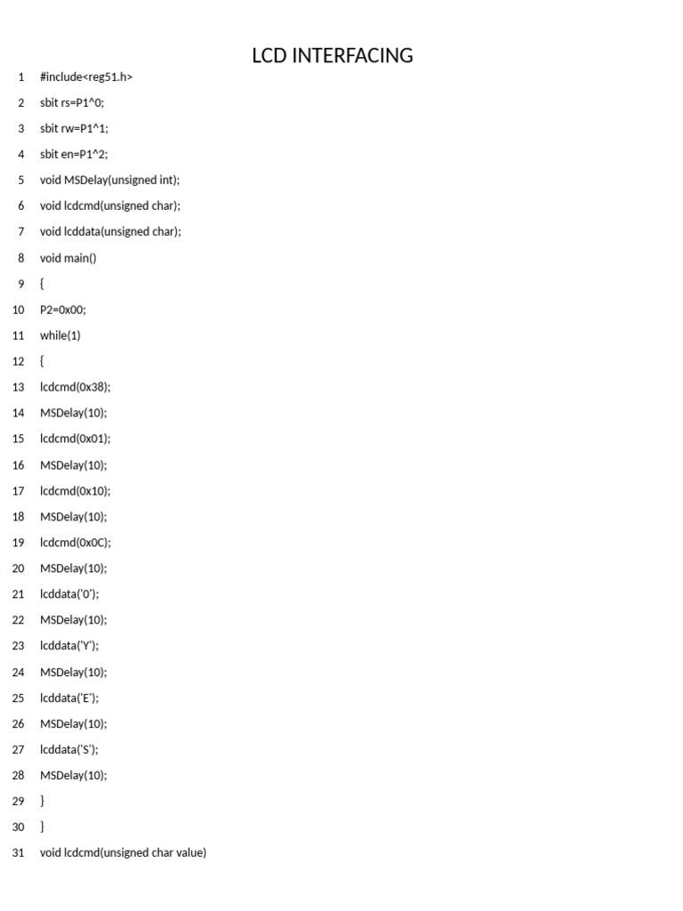 The document contains C code for interfacing an LCD with a microcontroller using the 8051 architecture. It includes functions for sending commands and data to the LCD, as well as a delay function for timing. The main loop initializes the LCD and displays the characters '0YES' on the screen.