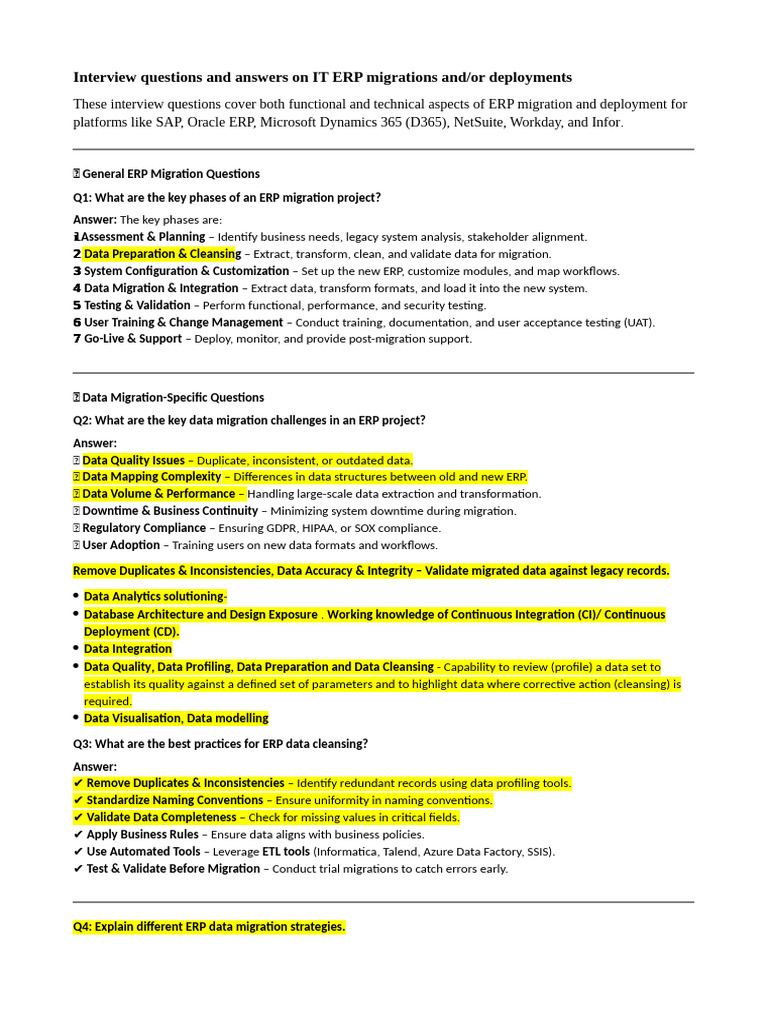 These interview questions cover both functional and technical aspects of ERP migration and deployment for
