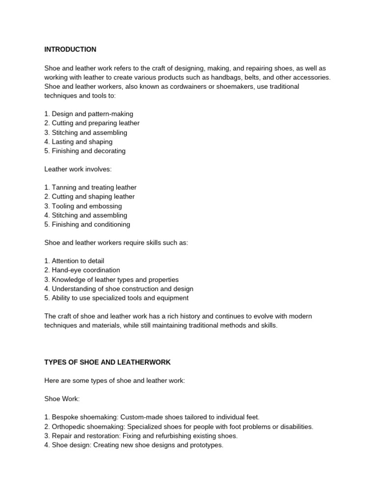 Shoe and leather work refers to the craft of designing, making, and repairing shoes, as well as