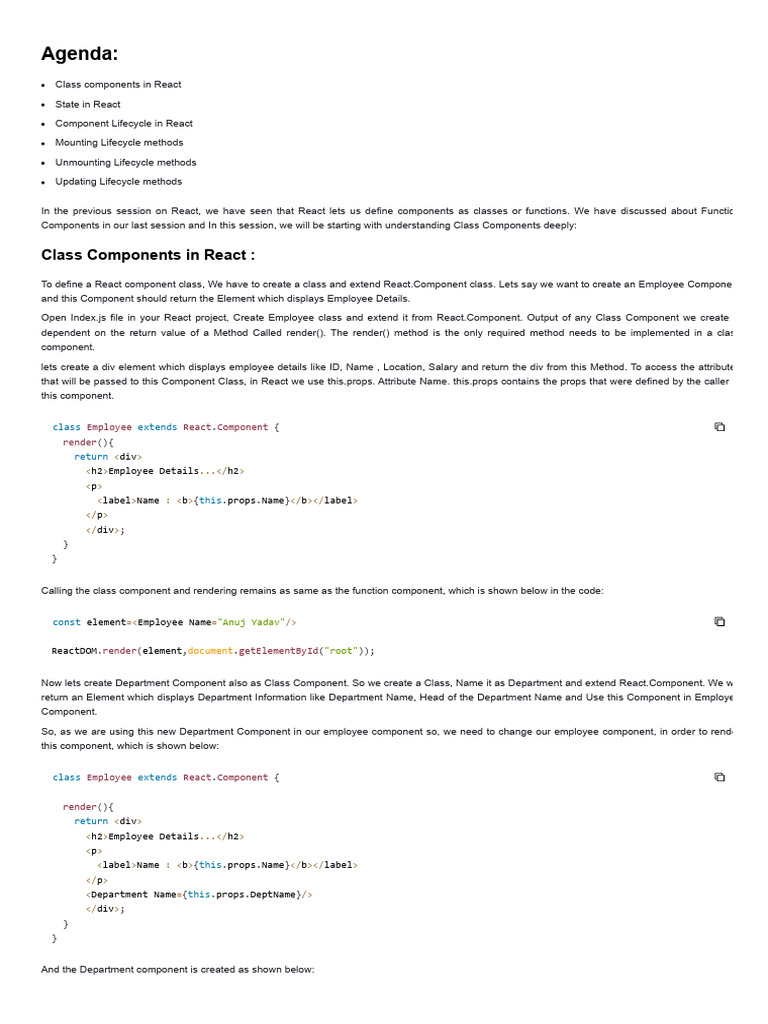 Open Index.js file in your React project, Create Employee class and extend it from React.Component. Output of any Class Component we create