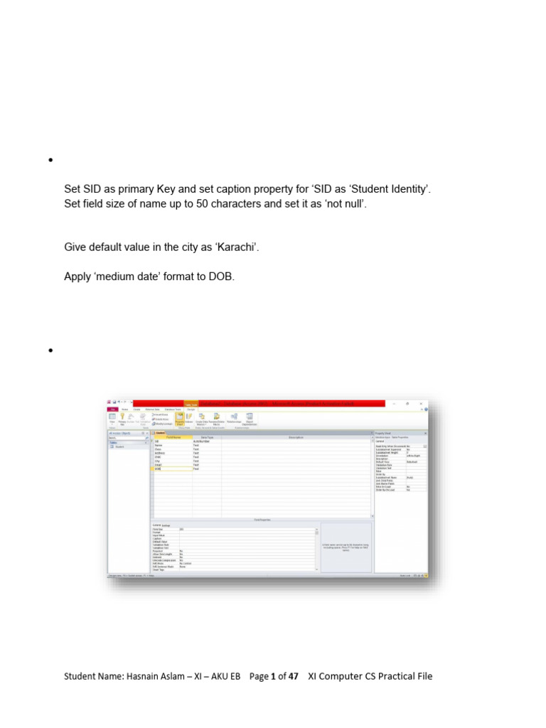 1. Set SID as primary Key and set caption property for ‘SID as ‘Student Identity’.