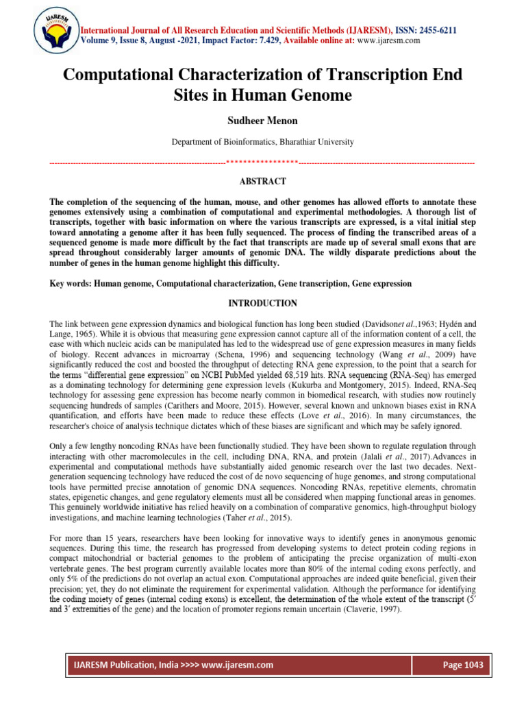 [24] Sudheer Menon (2021) “Bioinformatics approaches to understand gene looping in human genome” EPRA